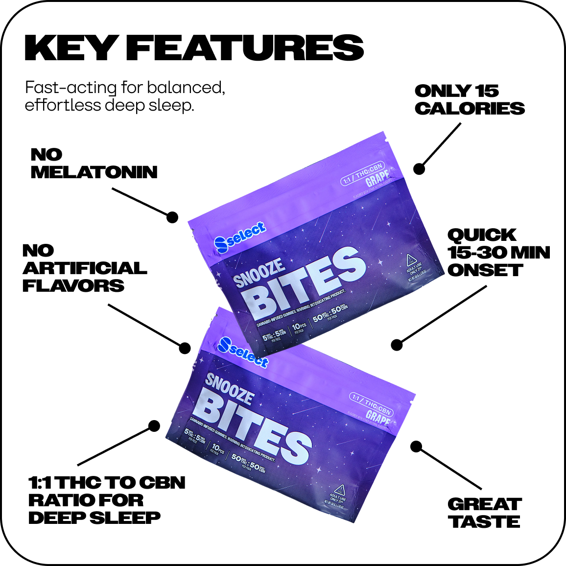 - 50mg THC + 50mg CBN Total per Pack